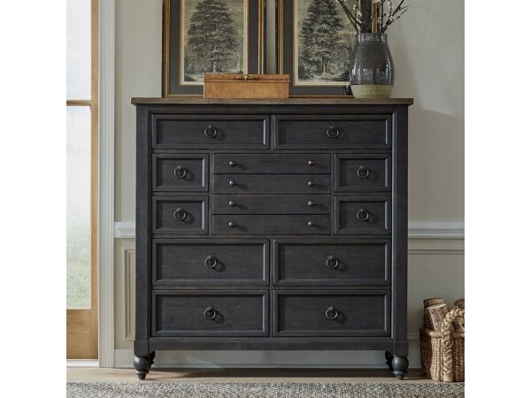 The Americana Farmhouse 12-drawer chesser combines a dusty black base with a taupe top and antique brass hardware. It features French/English dovetail construction, full extension glides, and felt-lined top and cedar-lined bottom drawers.