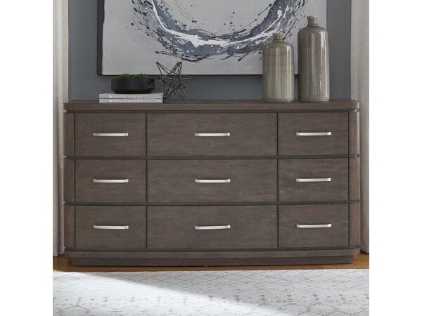 This sophisticated 9-drawer dresser, crafted from rubberwood solids and split heart white oak veneers, boasts a satin espresso finish with soft contemporary bow shaping and a starburst veneer top. It features soft-closing drawers, felt-lined top drawers,