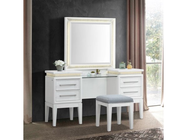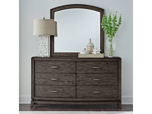 This traditional dresser and mirror set offers ample, protected storage. It includes premium felt-lined top drawers, cedar-lined bottom drawers, and a 1-inch beveled edge mirror, all accented with antique brass knob hardware.