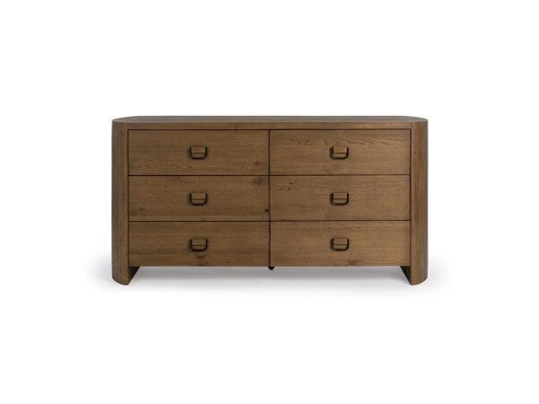 This Carolina Park dresser is crafted from Rubberwood solids and Split Heart White Oak veneers with an Amber Brown finish. It features seven drawers, including felt-lined top drawers and cedar-lined bottom drawers with soft-closing guides.