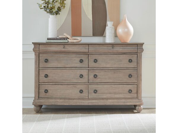 This 8-drawer dresser offers ample storage with classic Louis Philippe styling, featuring felt-lined top drawers and cedar-lined bottom drawers. The piece is accented with antique brass drop ring hardware and supported by bun feet.