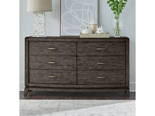 This 6-drawer dresser offers ample storage with premium felt-lined top drawers and cedar-lined bottom drawers for delicate items. Its design features bow shaping, a floating style base, and antique brass bar pull hardware.