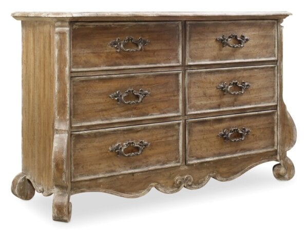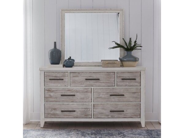 Crafted from Poplar solids and Spruce veneers, this seven-drawer dresser features a two-tone Weathered White and Parchment Brown finish. It includes soft-closing drawers, felt-lined top drawers for delicates, and cedar-lined bottom drawers for aromatic st