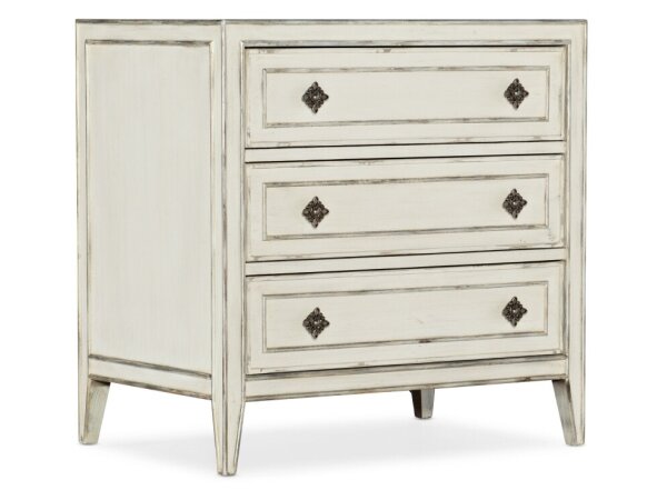 Two-drawer nightstand with cabriole legs and a shaped apron, finished in creamy Blanc with champagne and silver tipping. Oak veneers and jewelry-inspired pulls add refined, traditional style.