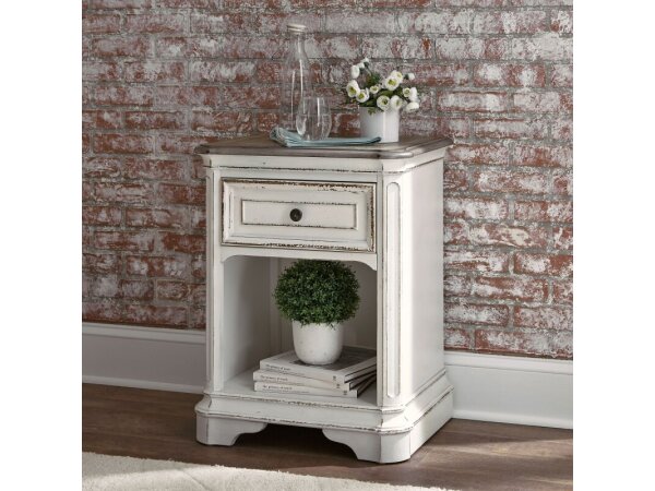 This European Traditional 1-drawer nightstand features a felt-lined top drawer, a bottom shelf for storage, and built-in USB ports. It is crafted with poplar solids and a distressed antique white finish.