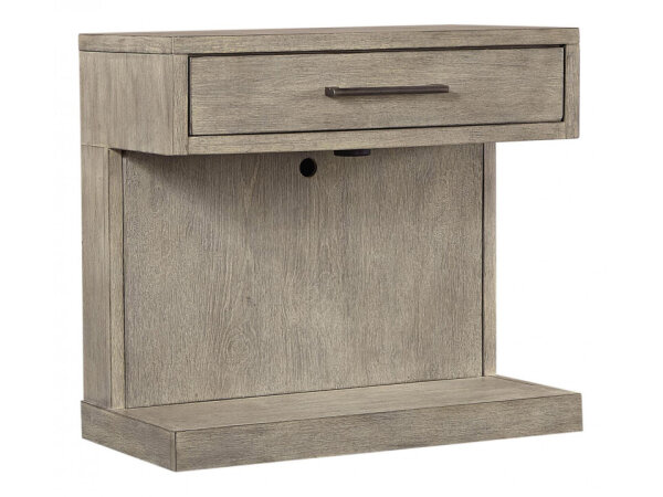 Two-drawer nightstand with integrated power bar offering 3 outlets and a live USB port, plus a felt-lined top drawer and a shelf-forming lower drawer. Oak veneers in a Jewel silver finish with an eglomise back panel.