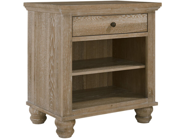 One-drawer nightstand in glazed burlap with a chalk-tone front and champagne bar pull. Includes a rear USB outlet and cord clip for streamlined bedside charging.