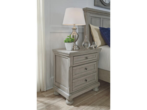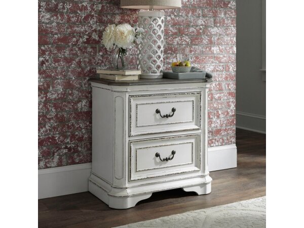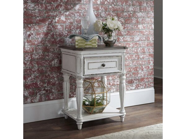This 3-drawer bedside chest in European Traditional design features a felt-lined top drawer, cedar-lined bottom drawer, and a charging station with two USB ports. It is constructed from Rubberwood solids with a weathered brown and antique white finish.