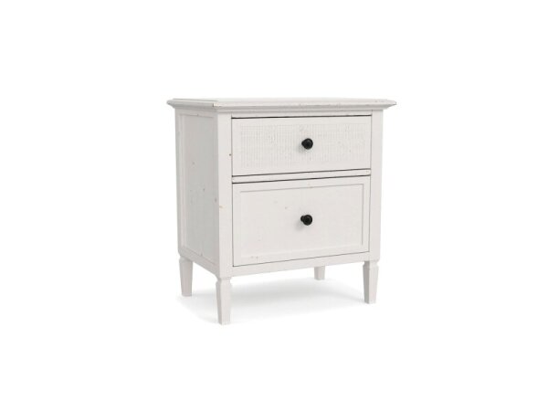 Hampton White bedside table with a gallery rail, two soft-close drawers, open shelf, and built-in power strip (2 USB, 1 AC). 24 in. W x 19 in. D x 27 in. H.