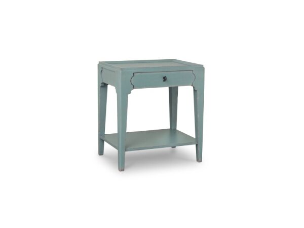 Wood bedside table with a soft-close drawer, key-shaped antiqued pewter pull, and recessed tray molding. Leveling feet and a 24 in. width fit neatly by the bed.