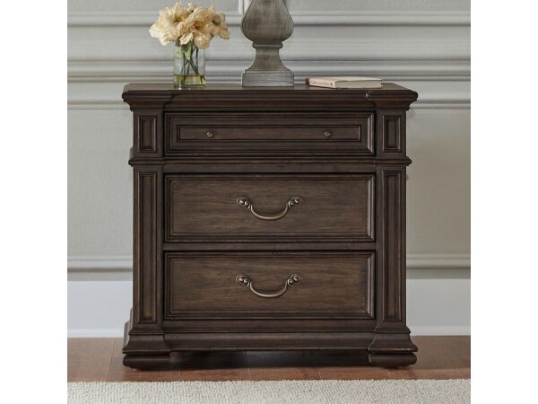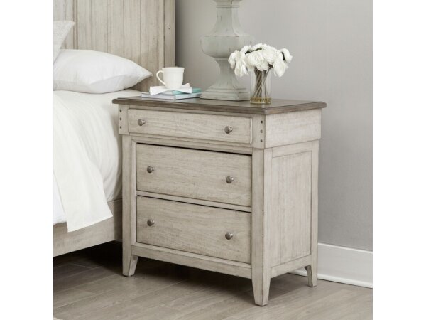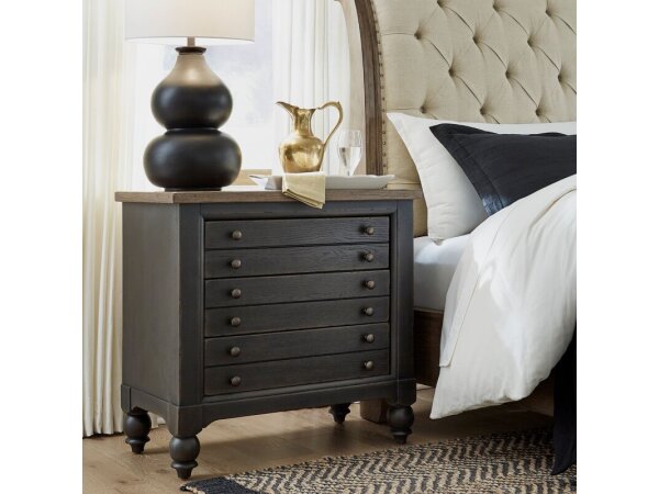 This South Bend nightstand features a modern design with a Burnished Clay finish, faux concrete top, and is crafted from Rubberwood solids and White Oak veneers. It includes a built-in charging station with 2 AC outlets, 1 USB-A, and 1 USB-C port, alongsi