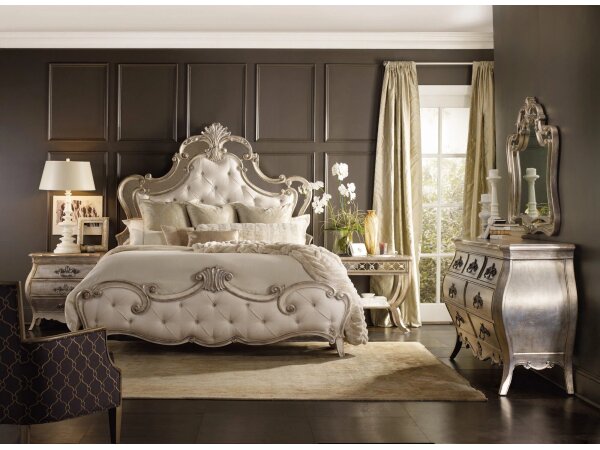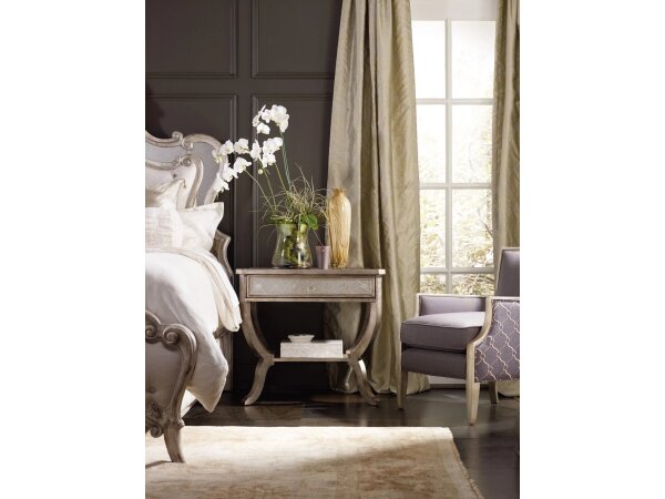 Two-drawer nightstand with cabriole legs and a shaped apron, finished in creamy Blanc with champagne and silver tipping. Oak veneers and jewelry-inspired pulls add refined, traditional style.