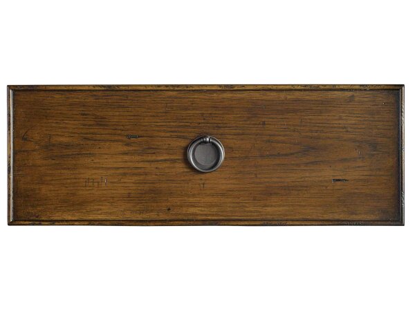 Traditional 3-drawer nightstand in pecky pecan veneers with a rustic pecan finish, bronze ring pulls, and shaped block feet. Includes cord management and a touch-dimmer feature for bedside convenience.