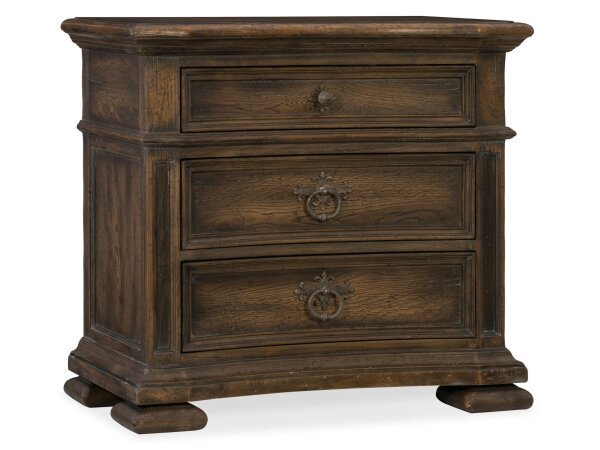 Three-drawer nightstand in an Antique Slate patina with acanthus and column details, featuring a cedar-lined bottom drawer, rear receptacle with USB, and an ambient under-light.