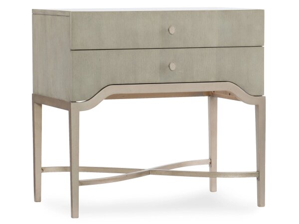 Two-drawer nightstand with champagne-silver metal trim and X-stretcher paired with a gray-beige, lightly sand-blasted walnut veneer. A modern bedside table offering closed storage with sculptural metal detailing.