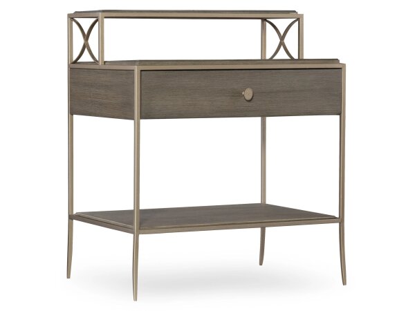 Leg nightstand in a soft gray, lightly sand-blasted walnut veneer with champagne-silver metal elements and a faux shagreen knob. Includes one drawer and two shelves for airy bedside storage.