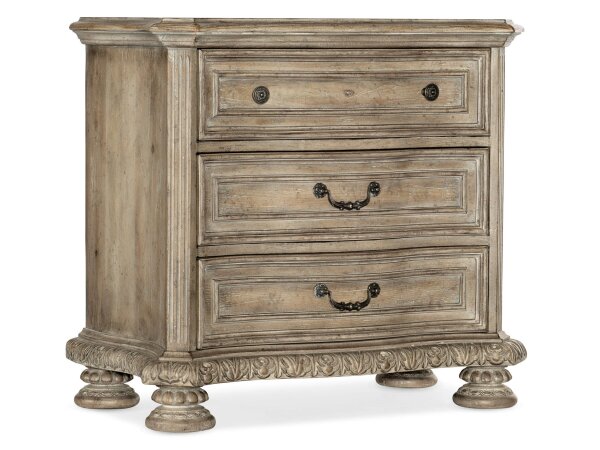 Three-drawer nightstand in an Antique Slate patina with acanthus and column details, featuring a cedar-lined bottom drawer, rear receptacle with USB, and an ambient under-light.
