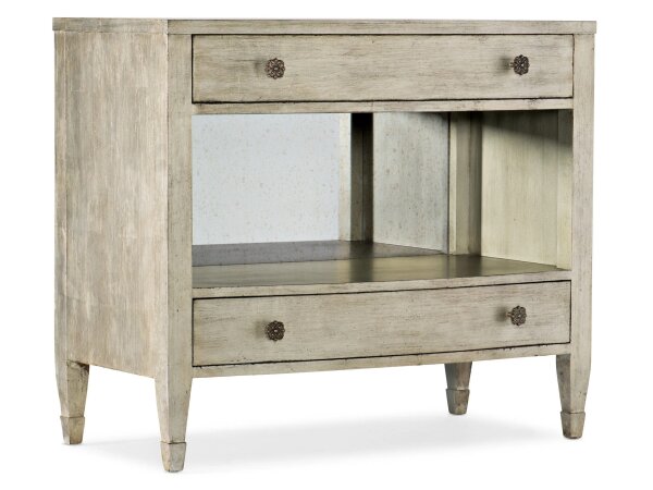 This 2-drawer nightstand combines European Traditional design with an antique white finish and weathered brown top. It features a felt-lined top drawer, bottom case dust proofing, and full extension metal drawer glides.