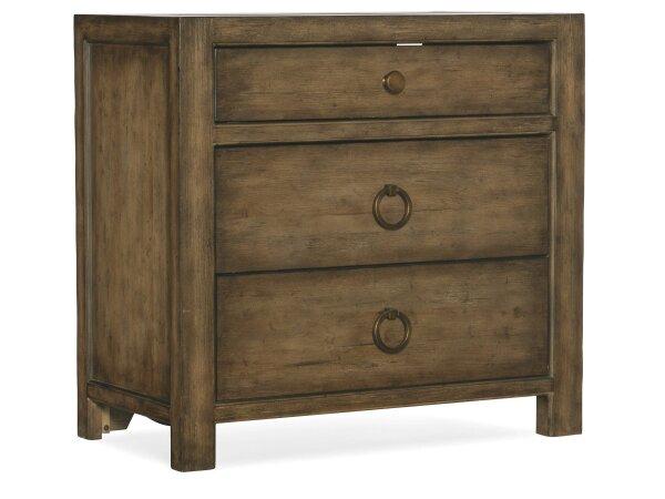 This River Place nightstand features three drawers, a distressed Riverstone White and Tobacco finish, and farmhouse styling. It offers soft-closing drawers with felt and cedar lining, plus a built-in charging station with AC, USB, and USB-C ports.