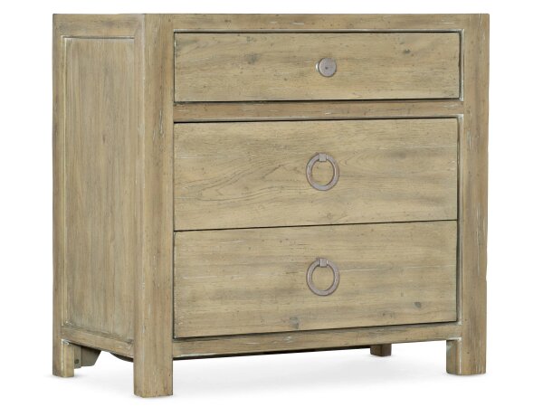 One-drawer nightstand crafted of Pecan veneers in a light Driftwood finish, featuring a self-closing drawer and solid-wood edge top. A clean, casual bedside table with durable construction.