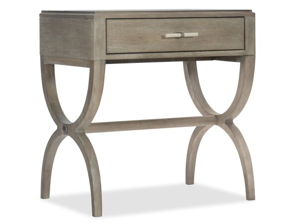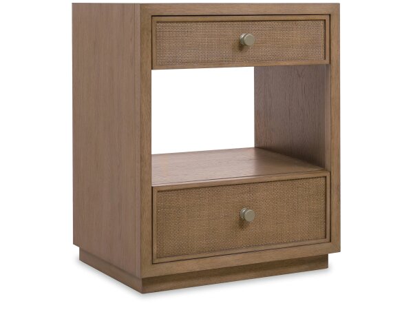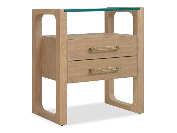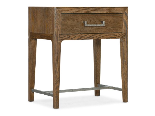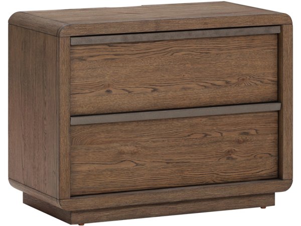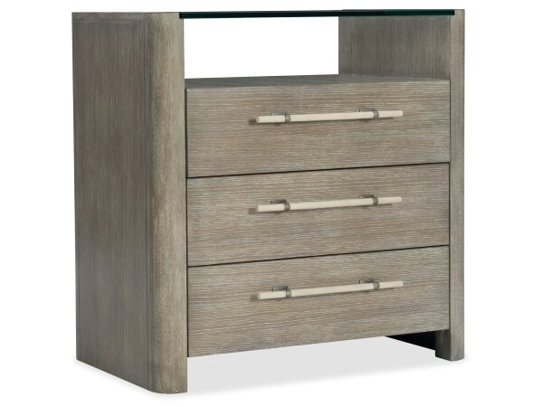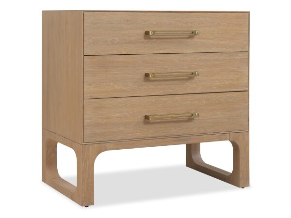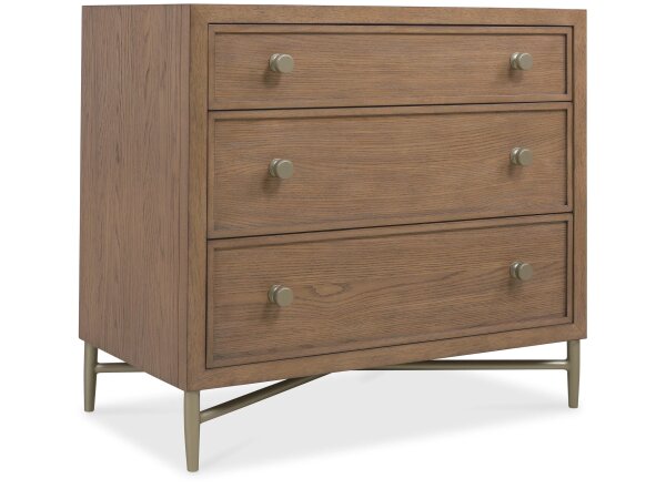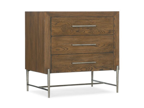 This 3-drawer bedside chest in European Traditional design features a felt-lined top drawer, cedar-lined bottom drawer, and a charging station with two USB ports. It is constructed from Rubberwood solids with a weathered brown and antique white finish.