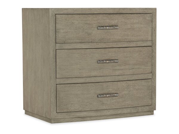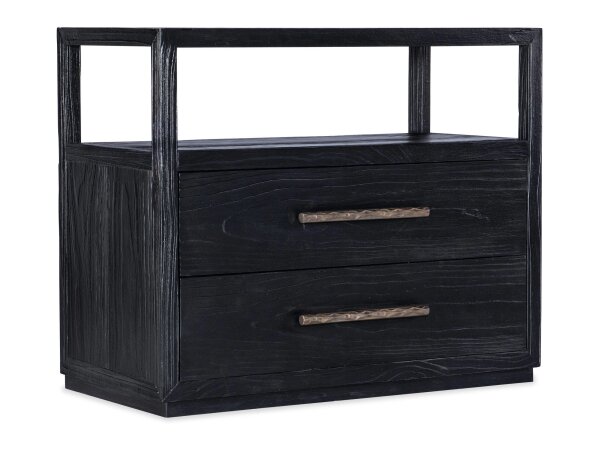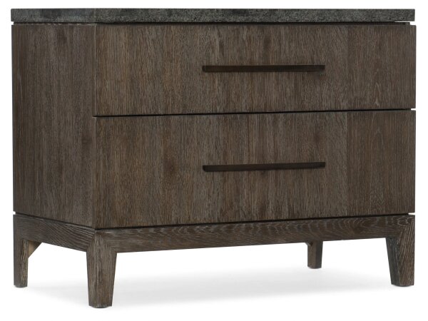 This South Bend nightstand features a modern design with a Burnished Clay finish, faux concrete top, and is crafted from Rubberwood solids and White Oak veneers. It includes a built-in charging station with 2 AC outlets, 1 USB-A, and 1 USB-C port, alongsi