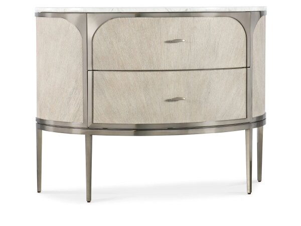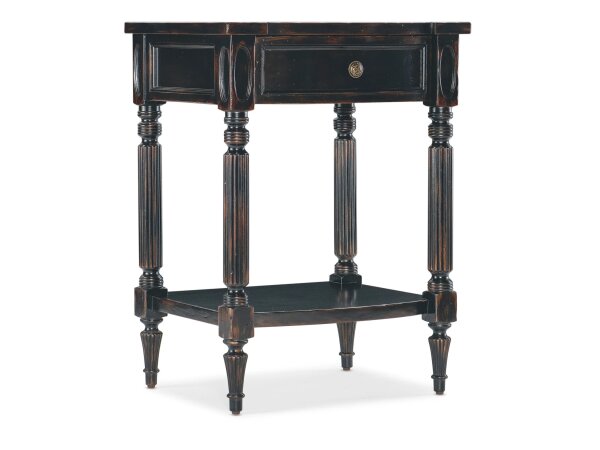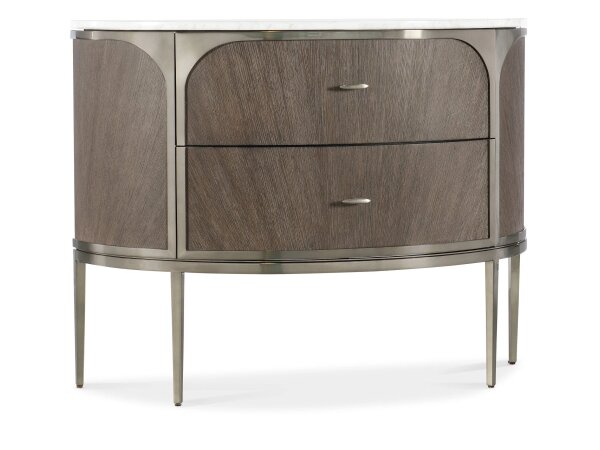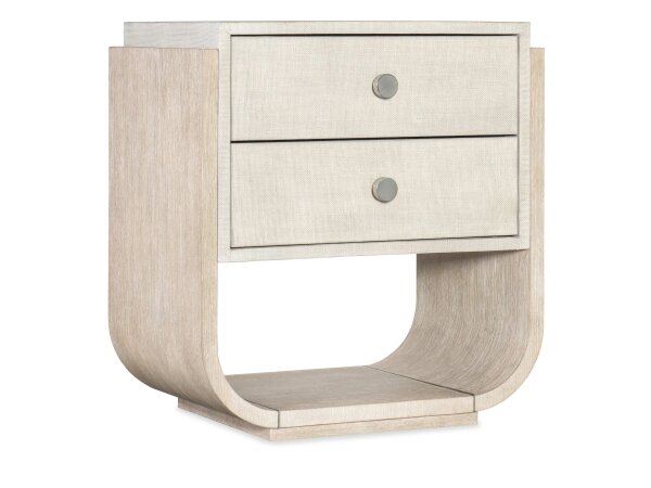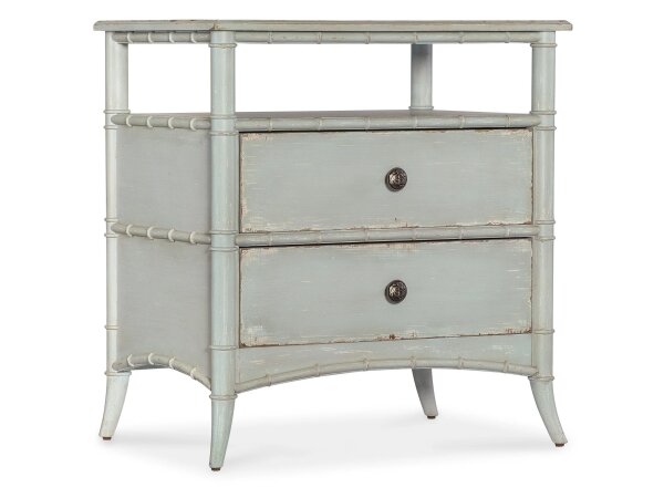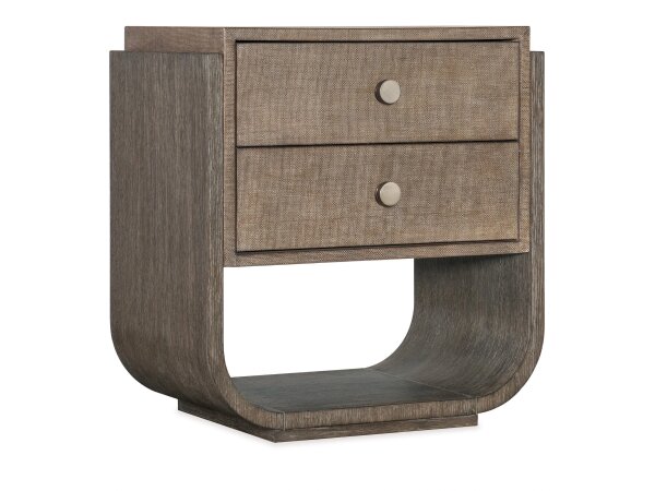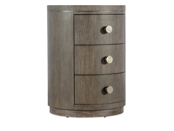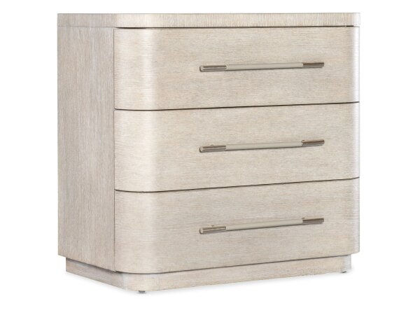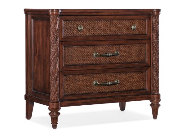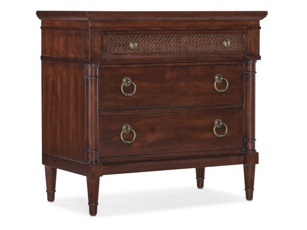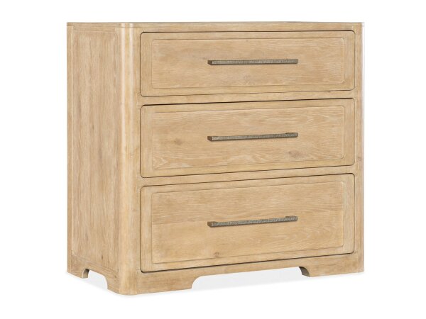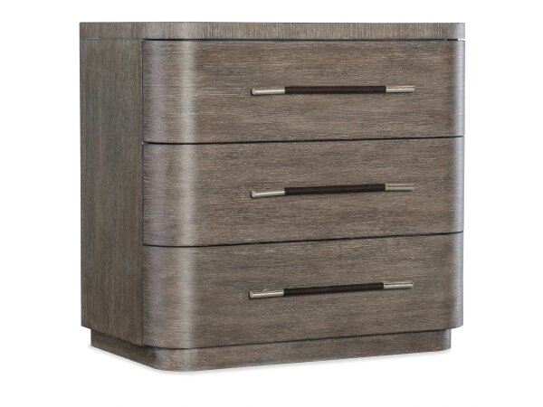 The Ivy Hollow 3-drawer nightstand features poplar solids with pine and alder veneers, finished in distressed weathered linen and dusty taupe. It includes felt-lined top and cedar-lined bottom drawers, plus a built-in charging station with two electrical