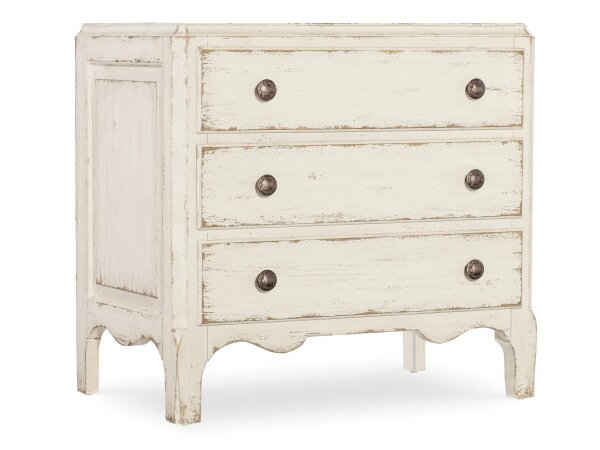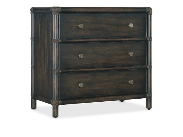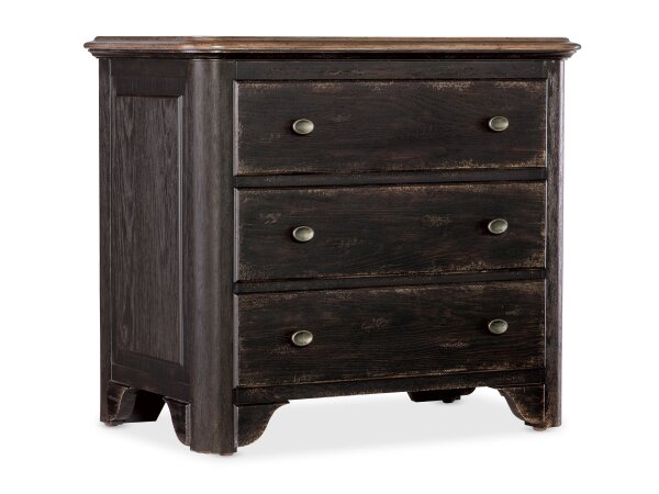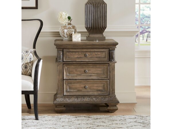This luxurious 3-drawer nightstand features a built-in charging station with two outlets and two USB ports. Crafted from rubberwood solids and hickory veneers, it has a Chestnut finish, carved details, and felt-lined and cedar-lined full extension drawers