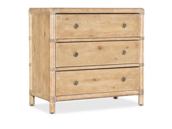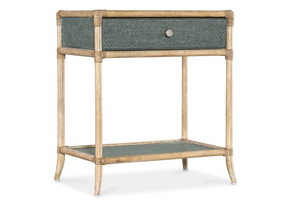 29 1/4" (74.3 cm) Bedroom Retreat Pole Rattan Bedside Table incorporating Maple Veneers, Resin, Engineered Raffia, Rope and Tempered Glass to enhance its visual appeal.