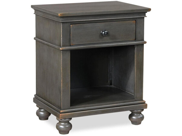 Traditional 3-drawer nightstand in pecky pecan veneers with a rustic pecan finish, bronze ring pulls, and shaped block feet. Includes cord management and a touch-dimmer feature for bedside convenience.
