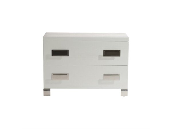 Two-drawer nightstand in time-worn gray with poplar/hardwood solids and maple veneer. Features a felt-lined top drawer, cedar-lined bottom drawer, cord clip, and a built-in 3-plug outlet with USB port.
