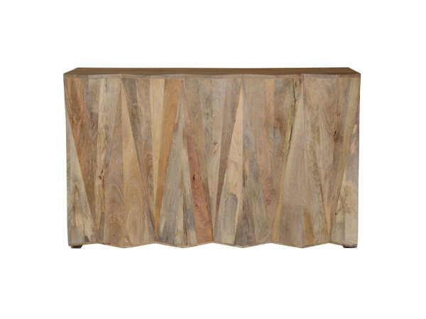 Bar cabinet with bi-fold rattan doors, two pull-out work surfaces, four wine shelves, eight stemware racks, and four self-closing drawers in light Driftwood. Interior lighting operates via a three-intensity touch switch.