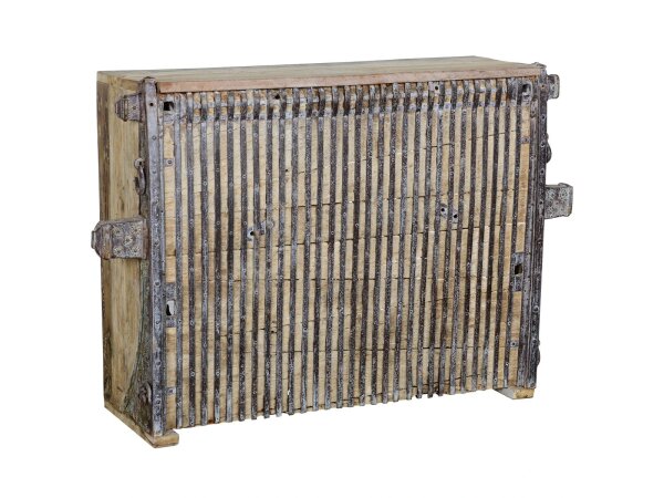 Bar cabinet with linen-wrapped, handpainted doors, adjustable glass shelves, and a mirrored back panel with a puck light for display. Red interior on a gold metal base with gold pendant pulls.