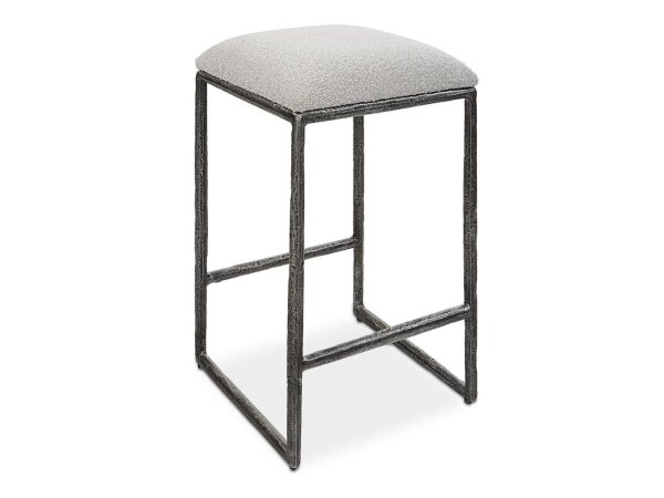 The Heartland console stool features solid rubberwood tapered legs with an antique white finish and a cushioned seat. It is upholstered in a textured grey taupe fabric and has a 26" height.
