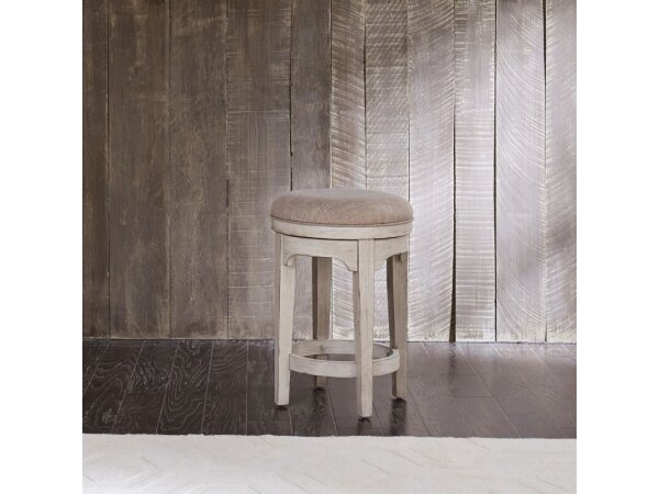 This Farmhouse Reimagined console swivel stool features an upholstered padded seat and tapered solid poplar wood legs with a heavily distressed antique white finish. It has a 250 lbs. weight limit.