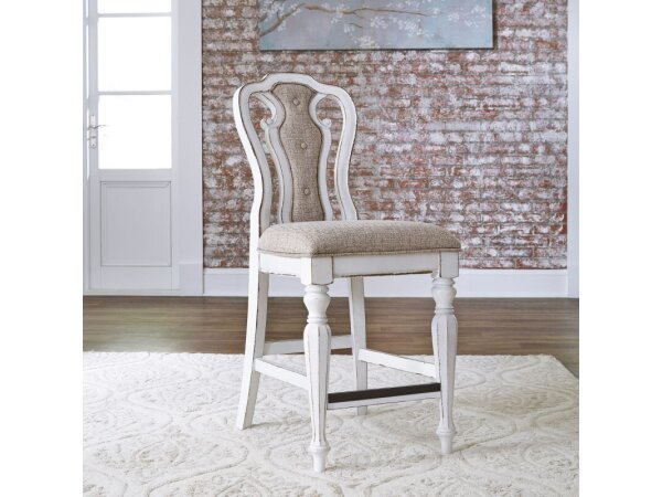 The Magnolia Manor counter height chair features a splat back with dog bone accents and ivory tweed chenille upholstery, crafted from rubberwood solids. It boasts a tufted back panel, turned legs, and nylon chair glides, perfect for counter height dining.