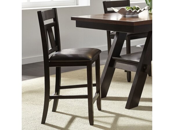 This Lawson splat back counter chair is built with rubberwood solids and walnut veneers in a dark espresso finish. It includes chocolate PVC upholstery, nylon glides, and consumer-friendly assembly for convenience.