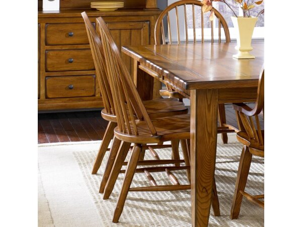 This Treasures bow back side chair is crafted from rubberwood solids with a rustic oak finish, featuring a saddle-shaped seat for comfort. It includes nylon chair glides to protect flooring.