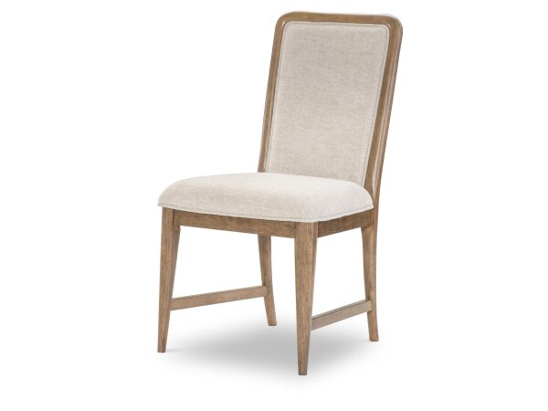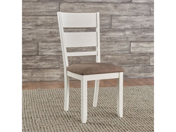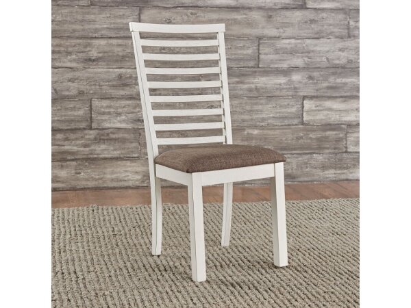 Crafted from rubberwood solids, this Brook Bay upholstered ladder back side chair features a Textured White finish with a seat upholstered in 100% polyester Grey Linen fabric. It includes square block legs with nylon chair glides.