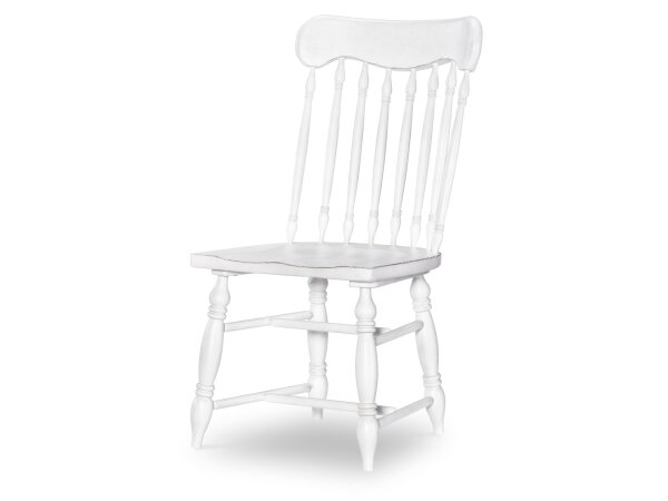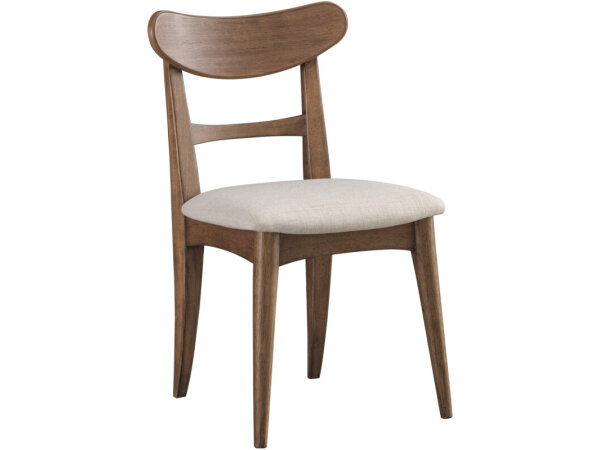 Side dining chair with an easy-care Zuri Cream performance-fabric seat and back, nailhead accents, and a carved reeded-diamond back in a light Driftwood finish.