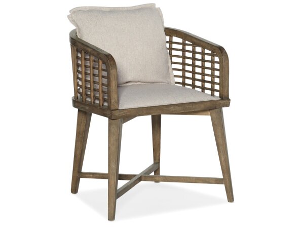 Dining arm chair with woven rope back, Cliffside dark wood frame, and an upholstered seat with loose pillow back in Zuri Cream performance fabric. Casual style suits relaxed dining spaces.