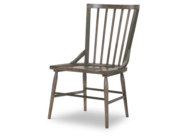 The Allyson Park slat back side chair, crafted from poplar and rubberwood solids, features a wire brushed white finish with a charcoal curved wooden seat. It includes a slat back, square tapered legs, and nylon glides for floor protection, offering a clas