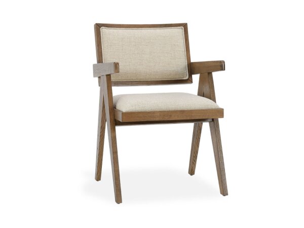 The Westfield upholstered armchair, crafted from rubberwood solids, features a Havana Brown finish and sand-colored upholstery with nail head accents. Its unique sloped arms and nylon chair glides combine antique design with modern comfort.