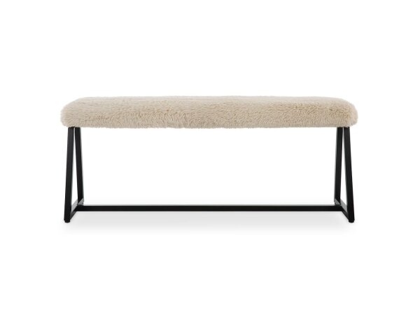 A space saving seating solution featuring a slim bench seat upholstered in plush long haired faux sheepskin in a toasty