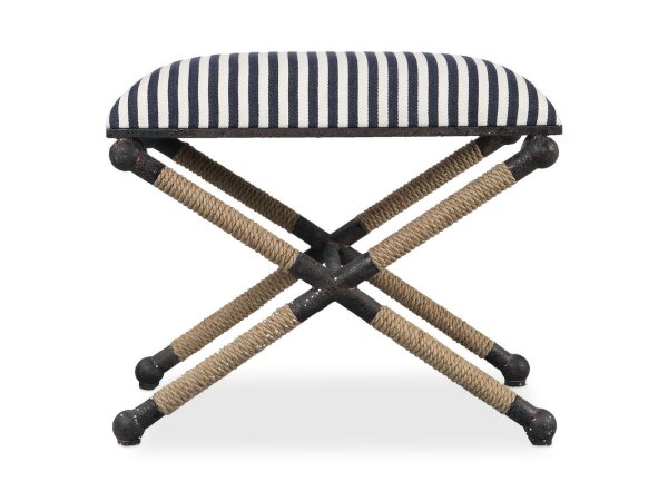 Rustic iron frame with a nautical touch, wrapped in natural fiber rope accents. Cushioned top is a sturdy, sailor-striped cotton