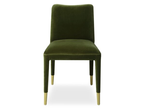 Perfect for modern dining, this armless chair features sleek lines covered in a moss green polyester velvet accented with brushed