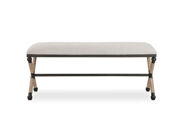 Rustic iron frame with a nautical touch, wrapped in natural fiber rope accents. Cushioned top is a sturdy, cotton in