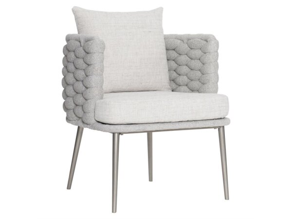 The Newport dining bench, crafted from rubberwood solids, features a Smokey Grey finish and a comfortable upholstered Grey Linen seat. Designed for stability with a center trestle and square block legs with wooden peg accents, it also includes nylon glide