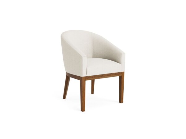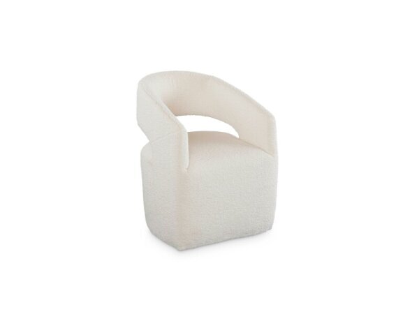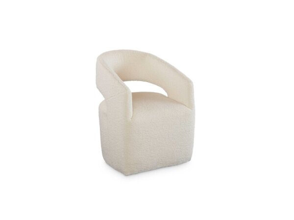 Fully upholstered barrel‑back dining chair with wraparound arms for cocooning comfort. Recessed casters enable easy movement; 33 in. H x 25.5 in. W x 25.5 in. D.