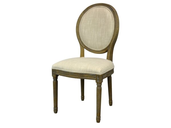 This ladder-back side chair is crafted from Rubberwood solids in a Weathered White finish for timeless charm. It features a comfortable, textured flax polyester upholstered seat and stands on elegant tapered legs.